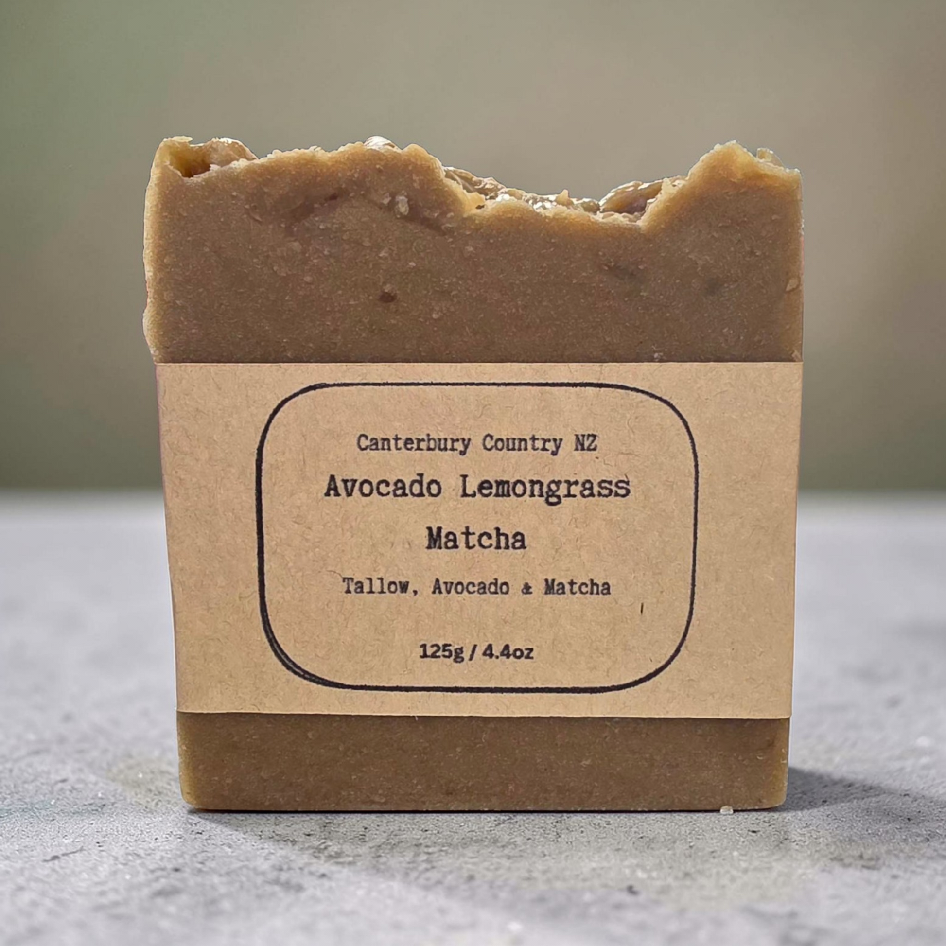 Ingredients: Beef tallow, castor oil, avocado oil, coconut oil, distilled water, sodium hydroxide (lye), Lemongrass essential oil, avocado puree, matcha powder, french green clay.